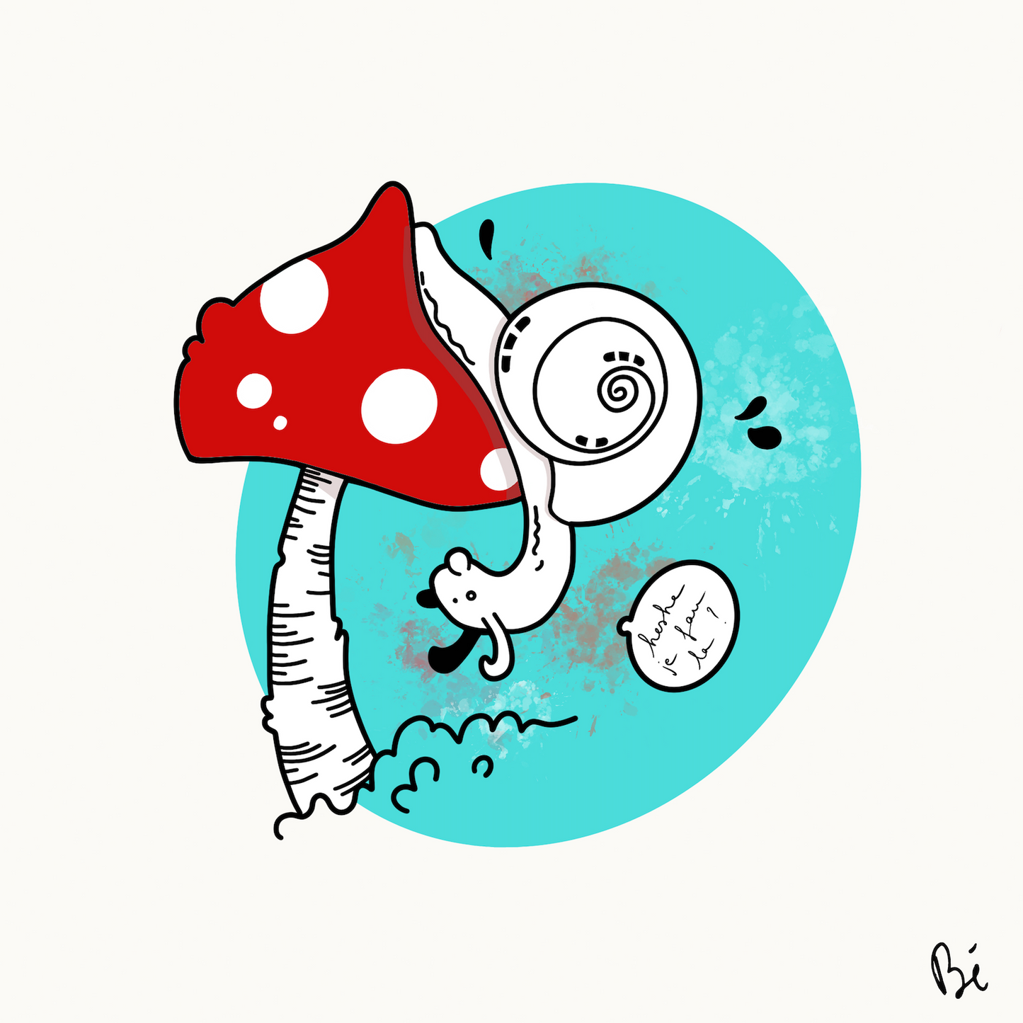 Ce dessin au feutre, réalisé dans un style humoristique et épuré, représente un escargot suspendu sous le chapeau d’un champignon rouge à pois blancs, rappelant l’iconique amanite tue-mouches. L’expression de l’escargot, avec sa bouche ouverte et sa posture déséquilibrée, suggère qu’il vient de glisser ou de perdre pied. Une bulle de dialogue accompagne la scène, contenant l’inscription manuscrite "qu'est-ce que je fous là?", renforçant le comique de la situation et donnant une personnalité expressive au personnage.