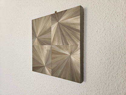 Cette création en marqueterie de paille de seigle, mesurant 25x25 cm, se distingue par son motif géométrique dynamique où chaque quart du carré présente une composition rayonnante. Les feuilles de paille, finement coupées et appliquées à la main, forment des faisceaux convergents, créant une impression de profondeur et de mouvement. Les nuances naturelles de la paille, allant du beige clair aux tons brun-gris, révèlent un jeu subtil de reflets soyeux grâce à la structure fibreuse du matériau, qui capte la lumière différemment selon l’angle de vue.